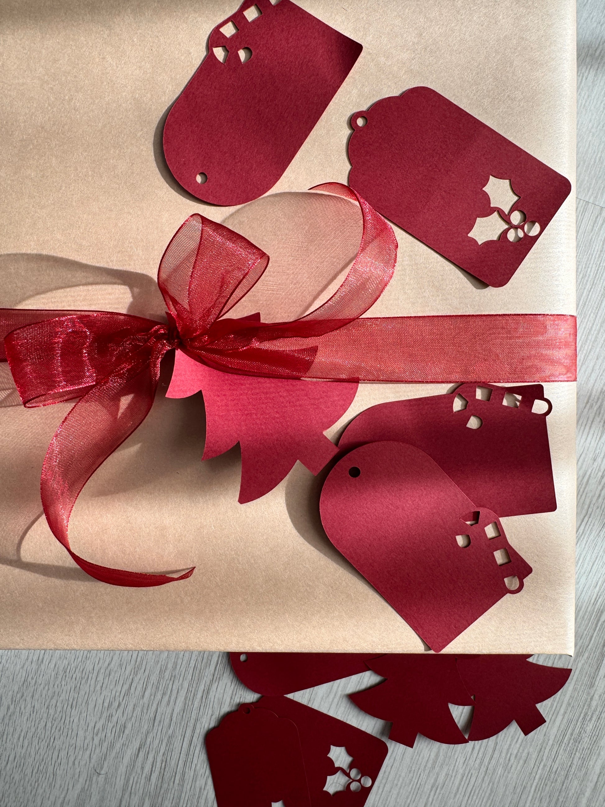Set de 24 etichete de Crăciun pentru cadouri, în diverse forme, cu perforare pentru panglică.