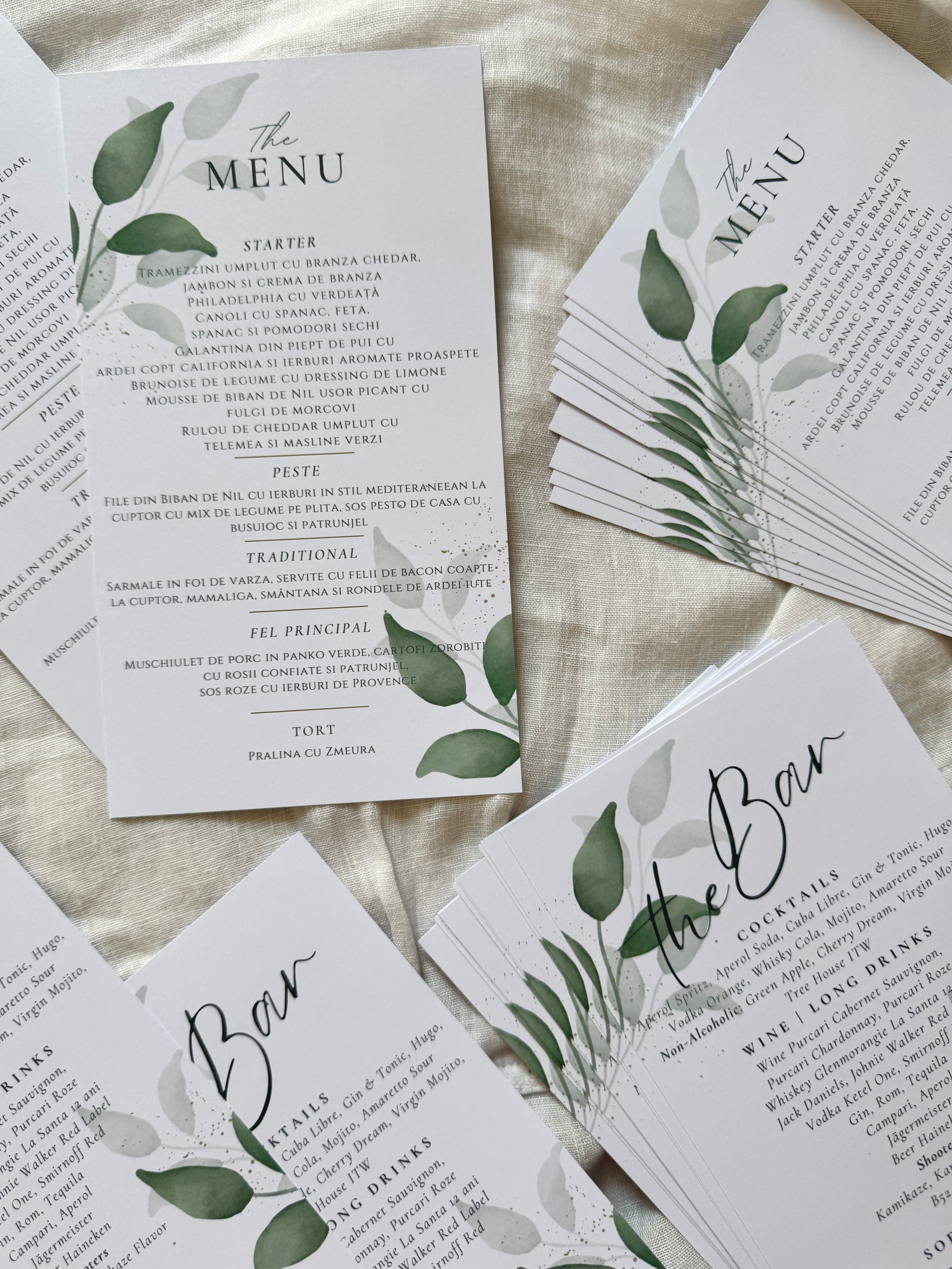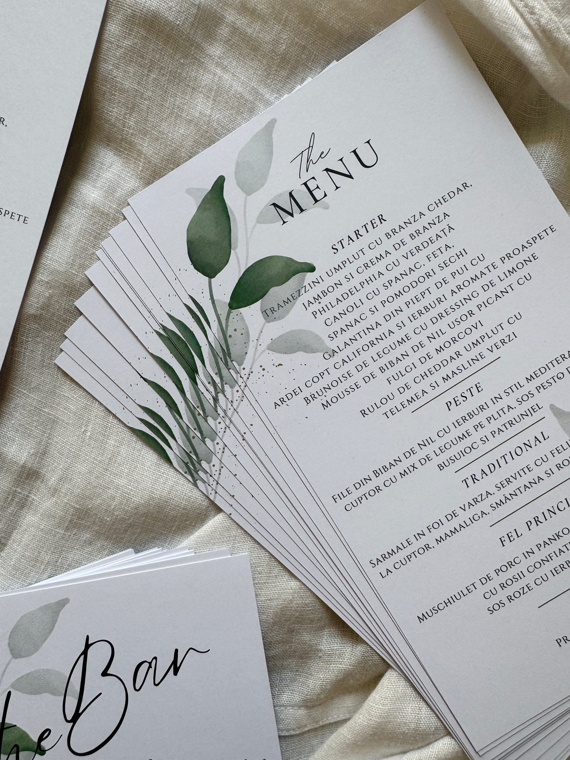 Grafica acestui meniu de nuntă poate fi personalizată în funcție de tematica evenimentului.